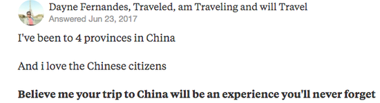 在美國(guó)問答網(wǎng)站Quora上隨便一搜“Chinatravel”,海量結(jié)果秒秒鐘刷屏。外國(guó)網(wǎng)友不是在中國(guó)玩得不亦樂乎,就是在準(zhǔn)備來中國(guó)的路上。還有一些外國(guó)小伙伴們表示,來中國(guó)旅游,回國(guó)后各種崩潰+“水土不服”!