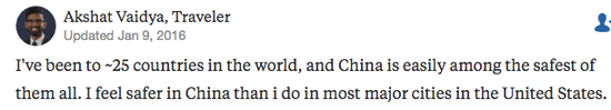 當(dāng)然,在中國(guó)旅游對(duì)老外的吸引力不只是便捷。一位去過全世界二十多個(gè)國(guó)家的外國(guó)驢友總結(jié)說,“中國(guó)是我去過的最安全的國(guó)家之一。我感覺在中國(guó)的大型城市比在美國(guó)安全多了。”