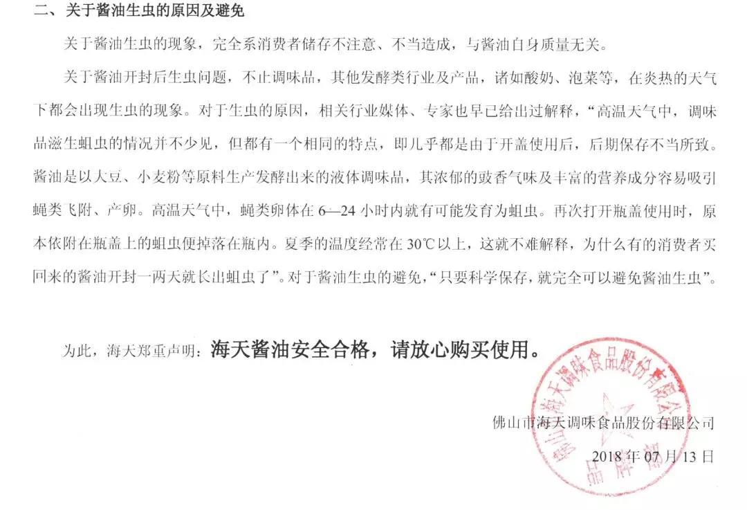 7月13日,海天味業(yè)在其官網(wǎng)發(fā)布“海天醬油安全合格,請(qǐng)放心購買使用”聲明。聲明稱,海天味業(yè)出場的產(chǎn)品均按照國家標(biāo)準(zhǔn)生產(chǎn),在出廠前均經(jīng)過檢驗(yàn)合格。因此,未開封的產(chǎn)品不會(huì)有活蟲和蟲卵生長。至于醬油開封后出現(xiàn)蛆蟲,海天味業(yè)解釋說,不止調(diào)味品,酸奶、泡菜等發(fā)酵產(chǎn)品在炎熱的條件下也容易生蟲。而醬油生蛆“完全是消費(fèi)者儲(chǔ)存不當(dāng)造成,與醬油自身質(zhì)量無關(guān)”。