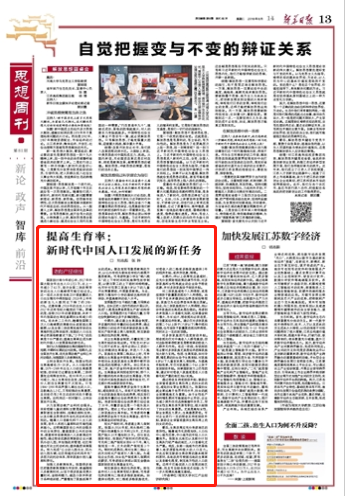 8月14日,江蘇省委機關(guān)報《新華日報》在第13版“思想周刊·智庫”欄目刊發(fā)了劉志彪、張曄聯(lián)合撰寫的題為《提高生育率:新時代中國人口發(fā)展的新任務(wù)》的署名文章。