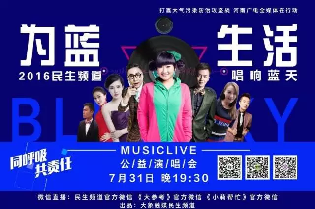 同呼吸,共責任,打贏大氣污染防治攻堅戰(zhàn),河南廣電全媒體在行動,為藍生活唱響藍天,2016民生頻道MUSIC LIVE公益演唱會7月31日晚19:30,喚醒你的雙耳,等你來聽……