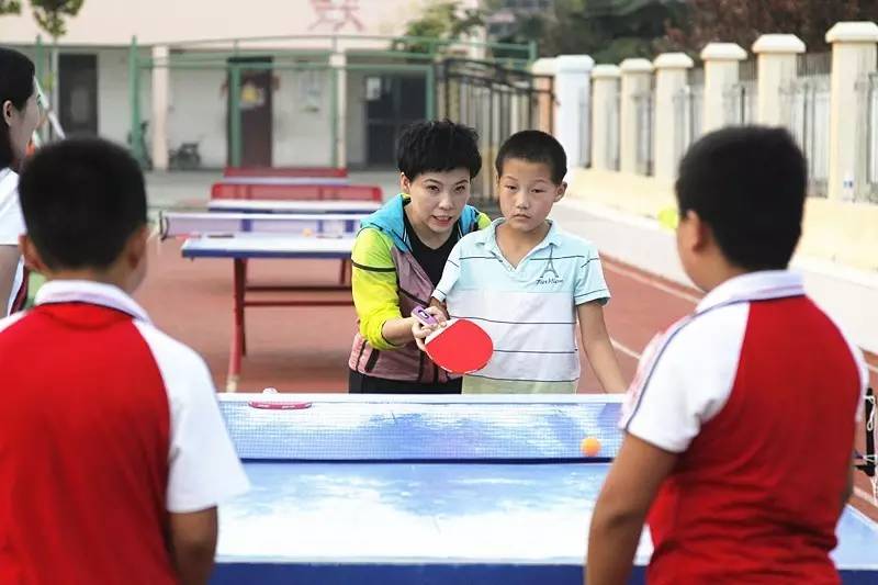 鄧亞萍與小隊長切磋球技 關(guān)注體育教育基礎(chǔ)發(fā)展