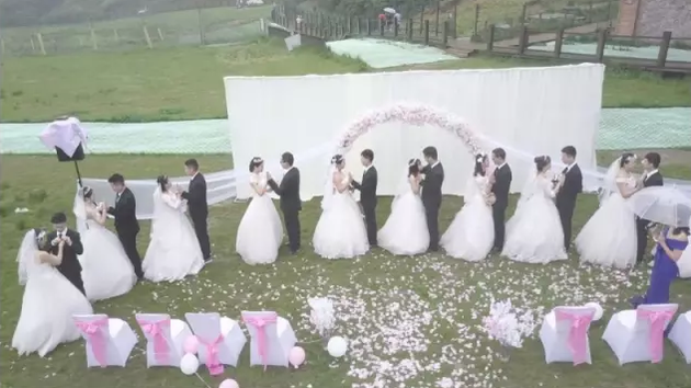 青山環(huán)抱的草坪中間,鮮花點(diǎn)綴,西服、婚紗、司儀……一樣不少,成對(duì)的新郎新娘溫情相擁,環(huán)繞的云霧和綿綿細(xì)雨,更為這場(chǎng)婚禮營(yíng)造了浪漫的氣氛。據(jù)網(wǎng)上文章稱(chēng),婚禮現(xiàn)場(chǎng)的新郎、新娘們,是來(lái)自成都一高校工程造價(jià)管理專(zhuān)業(yè)大四一畢業(yè)班的15對(duì)情侶。