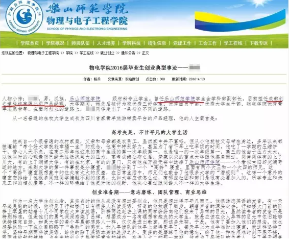 樂(lè)山師院學(xué)院官網(wǎng)上貼出的關(guān)于李飛創(chuàng)業(yè)的典型事跡