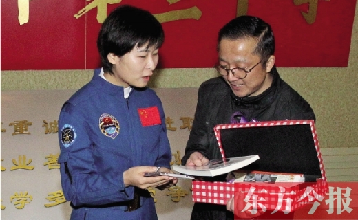 禮品一一打開,劉洋臉上的表情,除了驚喜還是驚喜:代表“問鼎蒼穹”的司母戊鼎,印有飛天字樣的青花瓷盤和唐三彩的馬,還有一本由東方今報記者為劉洋而編著的書《飛天嫦娥劉洋》。