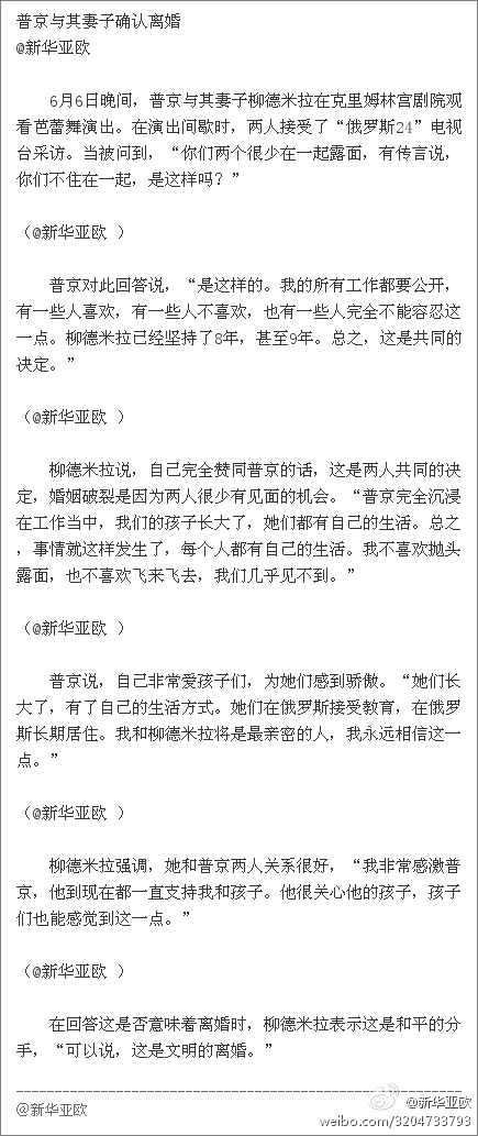 6月6日晚間,普京與其妻子柳德米拉在克里姆林宮劇院觀看芭蕾舞演出。在演出間歇時,兩人接受了“俄羅斯24”電視臺采訪。當(dāng)被問到,“你們兩個很少在一起露面,有傳言說,你們不住在一起,是這樣嗎?”普京與柳德米拉在回答問題時承認兩人已離婚。