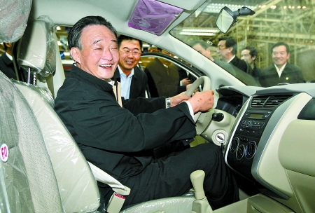 4月13日,中共中央政治局常委、全國(guó)人大常委會(huì)委員長(zhǎng)吳邦國(guó)在東風(fēng)日產(chǎn)(鄭州)有限公司考察工作。圖為吳邦國(guó)委員長(zhǎng)坐上一輛銀色樣車(chē),查看車(chē)內(nèi)配置情況。 河南日?qǐng)?bào)記者 郭 宇 李建峰 攝