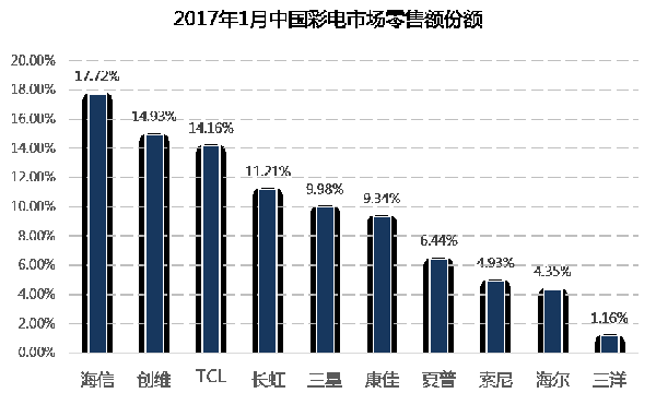 根據(jù)中怡康最新發(fā)布的2017年1月份月報(bào)統(tǒng)計(jì)數(shù)據(jù),海信電視零售量、零售額占有率分別達(dá)到16.7%和17.7%,雙雙高居中國(guó)彩電市場(chǎng)銷售量和銷售額占有率的第一位,其中銷售額占有率超出第二名2.79個(gè)百分點(diǎn).