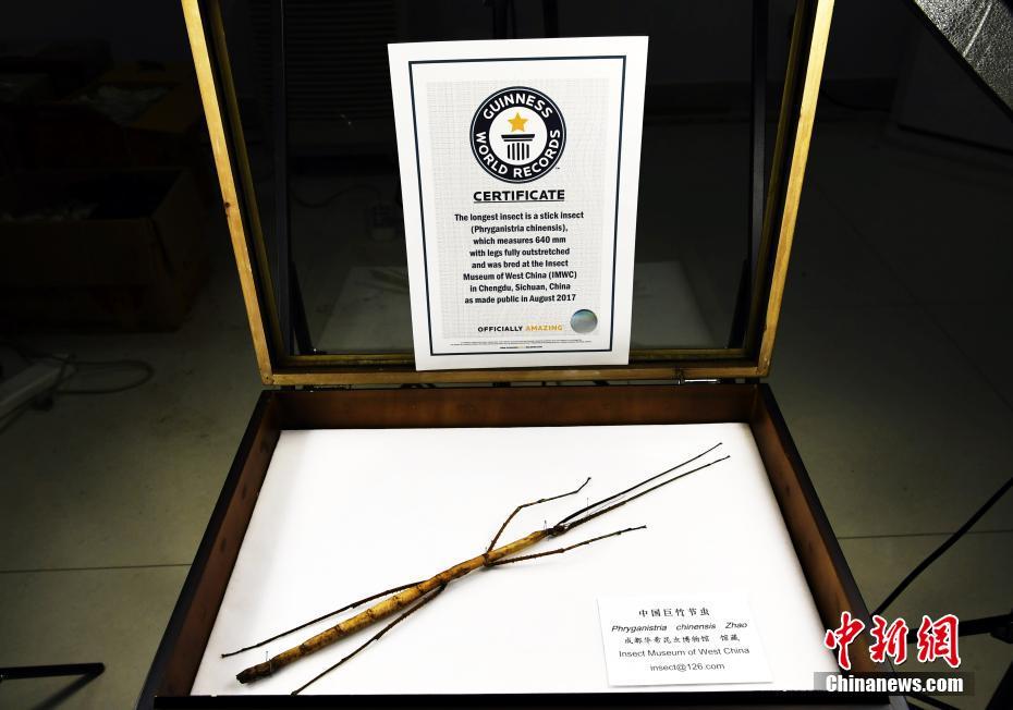 圖為中國(guó)巨竹節(jié)蟲(chóng)(Phryganistria chinensis Zhao )最長(zhǎng)個(gè)體,與獲得的吉尼斯世界紀(jì)錄證書(shū)。