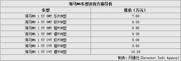 海馬汽車在進(jìn)入新一輪快速發(fā)展期以來,除了實(shí)現(xiàn)產(chǎn)品平臺(tái)的升級(jí)和新產(chǎn)品的推出之外,最重要的一項(xiàng)便是創(chuàng)新技術(shù)運(yùn)用。海馬旗下全新A+級(jí)轎跑車M6正是遵循此理念推出的車型。網(wǎng)通社在上海車展第一時(shí)間發(fā)回現(xiàn)場(chǎng)報(bào)道,海馬M6于今日正式上市,新車售價(jià)區(qū)間為7.68-10.28萬元,共7款車型。這款新車搭載了一臺(tái)1.5L渦輪增壓發(fā)動(dòng)機(jī),匹配CVT變速箱。此外,新車還是海馬旗下首款搭載“moofun”系統(tǒng)的車型。
