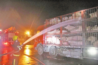 救援的消防官兵告訴大河報(bào)記者,現(xiàn)場(chǎng)需緊急救援的共有3輛運(yùn)豬車,約300頭豬。了解情況后,消防官兵隨即利用水槍向生豬噴水降溫,一個(gè)多小時(shí),原來無精打采的生豬開始活泛起來,待高速通行司機(jī)連忙開往目的地。