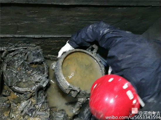 據(jù)@河南考古 微博消息,近日在河南一座古墓發(fā)掘現(xiàn)場(chǎng),出土了幾只裝有“肉湯”大鼎,。