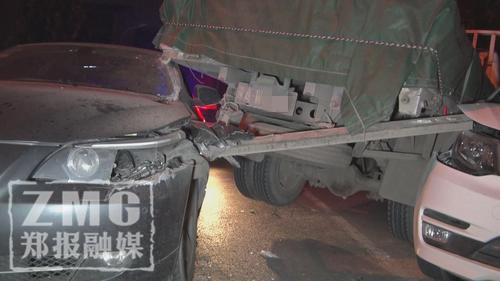 鄭報(bào)融媒記者看到,肇事寶馬車為懸掛豫A號(hào)牌的灰色5系轎車,該車車頭左側(cè)撞擊卡車后保險(xiǎn)杠后受損嚴(yán)重,受傷部位由車身延伸至駕駛艙,鐵質(zhì)車身被劃開一道約20厘米寬的口子,駕駛位上方車頂部位則卡在了卡車車尾之下。