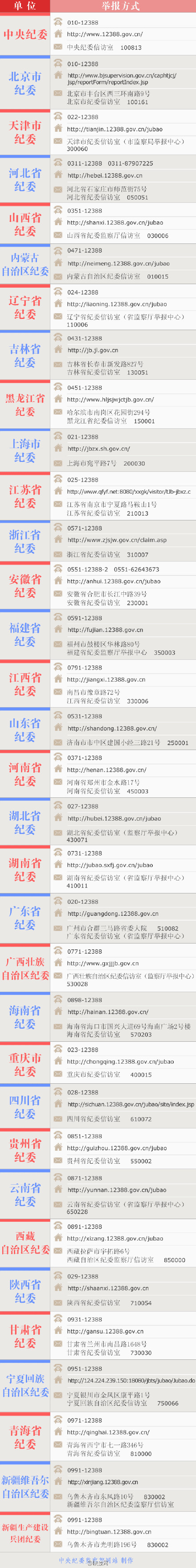 中央紀委、31省份及新疆生產建設兵團的舉報電話均已統(tǒng)一成12388,只是在區(qū)號上加以區(qū)分。中央紀委和北京市紀委共用010-12388一個舉報電話,新疆和新疆生產建設兵團則共用0991-12388;而河北和安徽在通用舉報電話之外,還額外設有舉報電話。