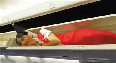 網(wǎng)傳多張圖片顯示有空乘人員躺在行李架上。網(wǎng)絡(luò)截圖