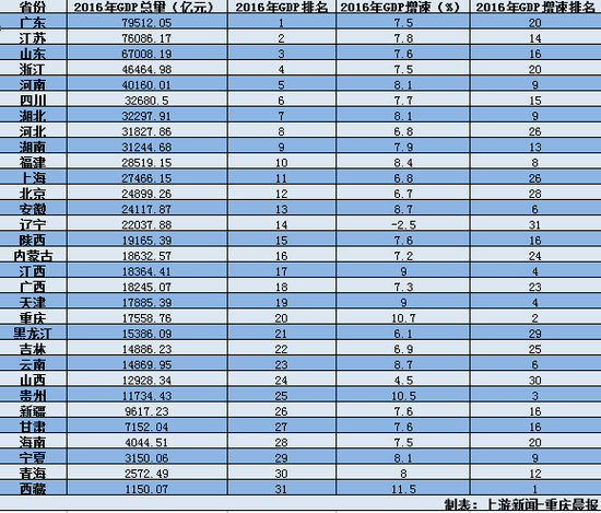 隨著2月19日海南省兩會開幕,地方兩會時間進入尾聲,2016年各地GDP數(shù)據(jù)也已全部出爐。上游新聞-重慶晨報記者根據(jù)各地政府工作報告和統(tǒng)計部門數(shù)據(jù)發(fā)現(xiàn),GDP總量達到3萬億元以上的省份增至9個。
