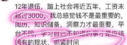 12年退伍,在社會上5年,工資未超過3000元,但是感覺錢不是最重要的,只是儲備,洞察力才重要,學(xué)習(xí)自己不知道是才是應(yīng)該有的狀態(tài)。