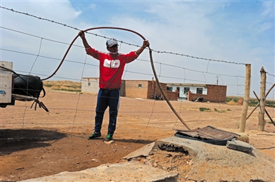 巴特爾的家在騰格里沙漠水源地上游,幾年前幾米下就能抽上水,現(xiàn)在水位下降至少40多米。