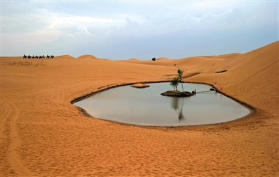 騰格里沙漠深處有一小湖泊,被開發(fā)成旅游景點(diǎn)。不過,由于地下水開采加劇,這個(gè)湖泊越來越萎縮。