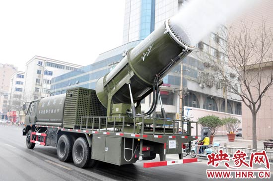 映象網(wǎng)訊(記者 王濤 通訊員 司佳 文/圖)“向著霧霾開炮……向著揚塵開炮……”12月26日上午,鄭州市經(jīng)三路街頭出現(xiàn)了一輛形似炮筒的“大家伙”,吸引了來往車輛及行人的目光。