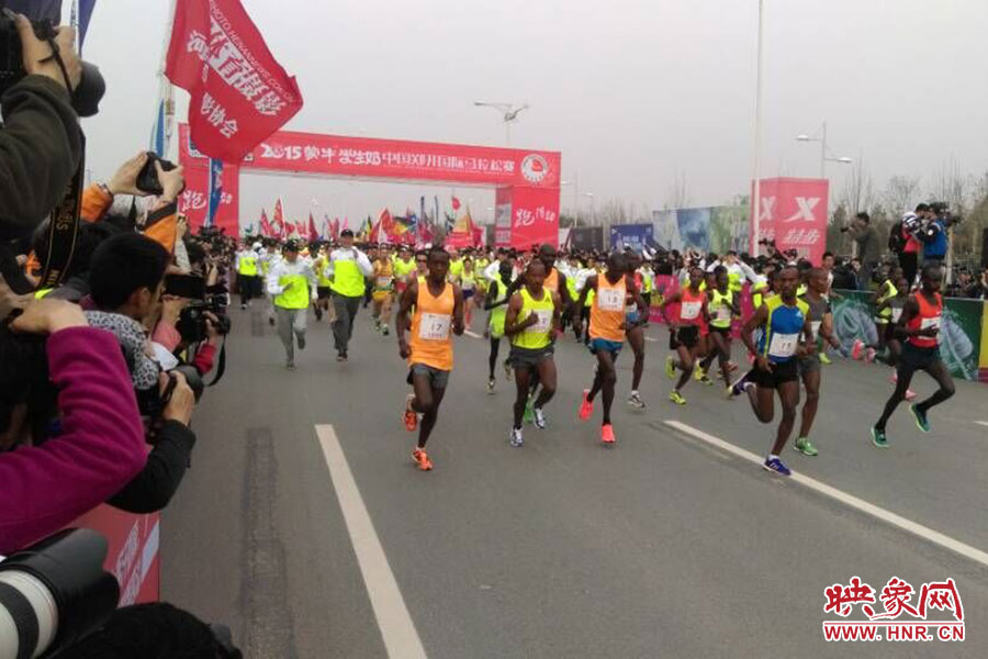 映象網(wǎng)訊(記者 駱瓊 阮海峰/文 閆善良 段晉哲/圖)3月29日上午8時30分,2015中國鄭開國際馬拉松賽在鄭東新區(qū)鳴槍開賽,來自29個國家和地區(qū)的4.9萬名運(yùn)動員在春天里激情開跑,人數(shù)再創(chuàng)歷史新高。