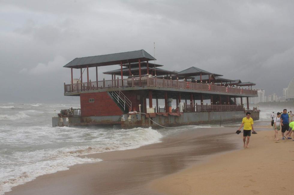 2015年6月23日,海南三亞,“鯨魚(yú)”臺(tái)風(fēng)襲擊海南省萬(wàn)寧市,三亞海面大風(fēng)大浪,2艘大型貨輪和一艘旅游船,被刮到了三亞灣沙灘上。