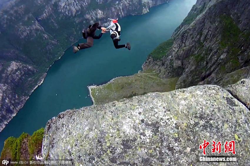 挪威Lysebotn,羅伯塔·曼奇諾和諾亞·巴恩森從高3500英尺(約合1066米)的懸崖上跳傘后在空中接吻。 圖片來源:CFP視覺中國