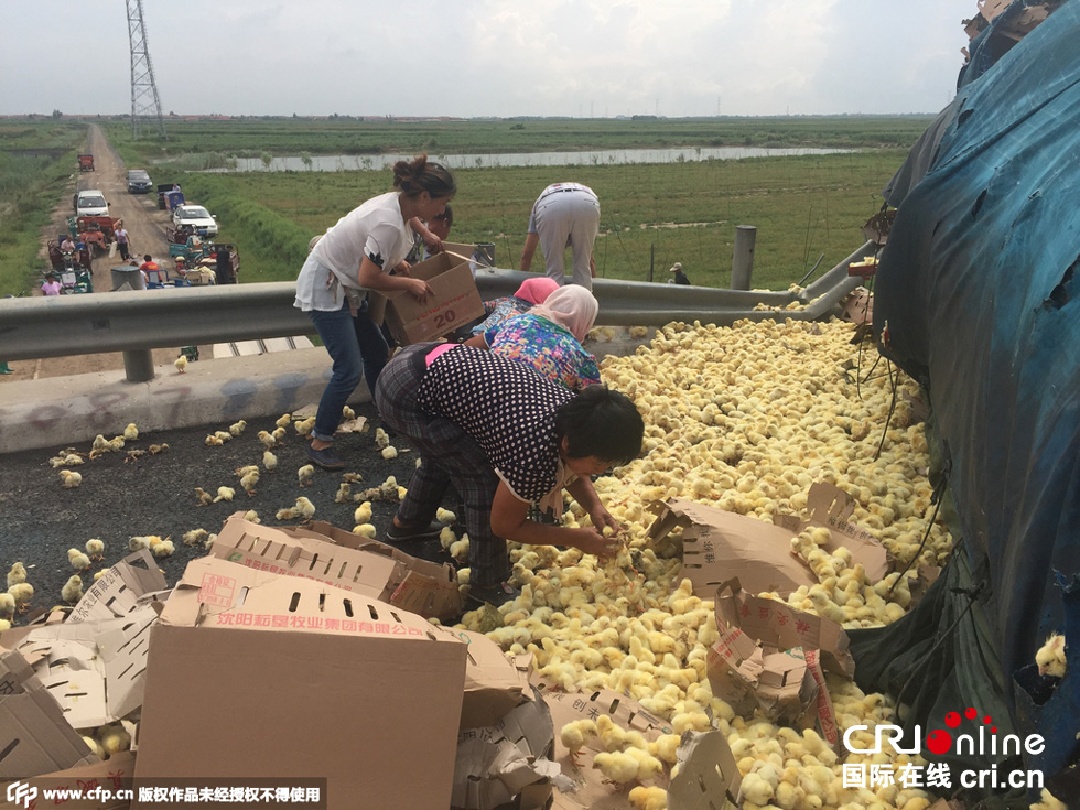 8月25日中午,山東榮烏高速濱州沾化區(qū)段,一輛山東禽類運輸車輛傾翻,車上裝有數(shù)萬只小雞。無數(shù)小雞散落在路上和高速護坡上,死的死傷的傷,大多數(shù)存活。