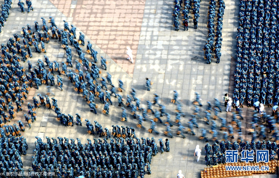 2015年9月14日,湖北武漢,當(dāng)日上午,武漢理工大學(xué)2015級本科生開學(xué)典禮暨軍訓(xùn)動員大會在該校南湖校區(qū)舉行,全校多個校區(qū)約9000名新生身著迷彩戎裝一起進行軍訓(xùn),場面震撼壯觀。南湖校區(qū)現(xiàn)場集合了約7000名新生參與軍訓(xùn),隊列整齊、英姿颯爽,熱情投入軍訓(xùn),開啟了朝氣蓬勃的大學(xué)新生活。圖片來源:cfp