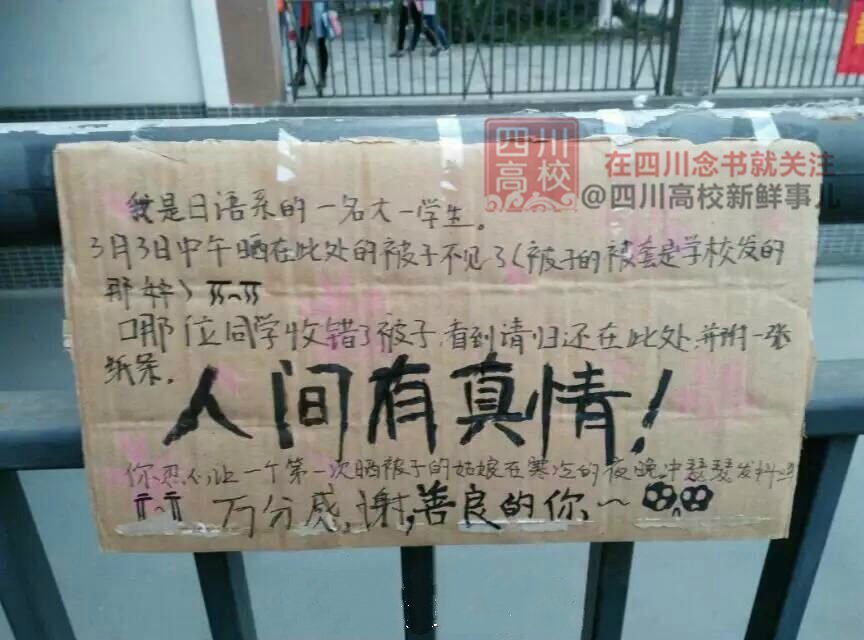 近日,四川外國(guó)語大學(xué)成都學(xué)院一女生在校內(nèi)曬的被子被其他同學(xué)誤拿,這位女生通過“人間有真情”海報(bào)、一系列“請(qǐng)往右看”便簽來定位一床沒人收的被子,以此尋找拿錯(cuò)被子的同學(xué)。這個(gè)萌辦法讓網(wǎng)友紛紛點(diǎn)贊。