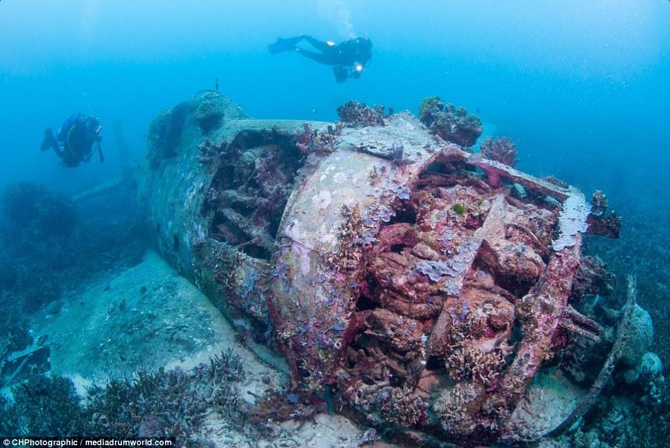 這些曾經(jīng)參與世界大戰(zhàn)的戰(zhàn)斗機(jī)如今安靜的躺在所羅門群島大海185英尺(約56米)的淺層海床上。今夕形成了鮮明的對(duì)比,英勇的美國(guó)F6F地獄貓戰(zhàn)斗機(jī)上覆蓋了大量的珊瑚。
