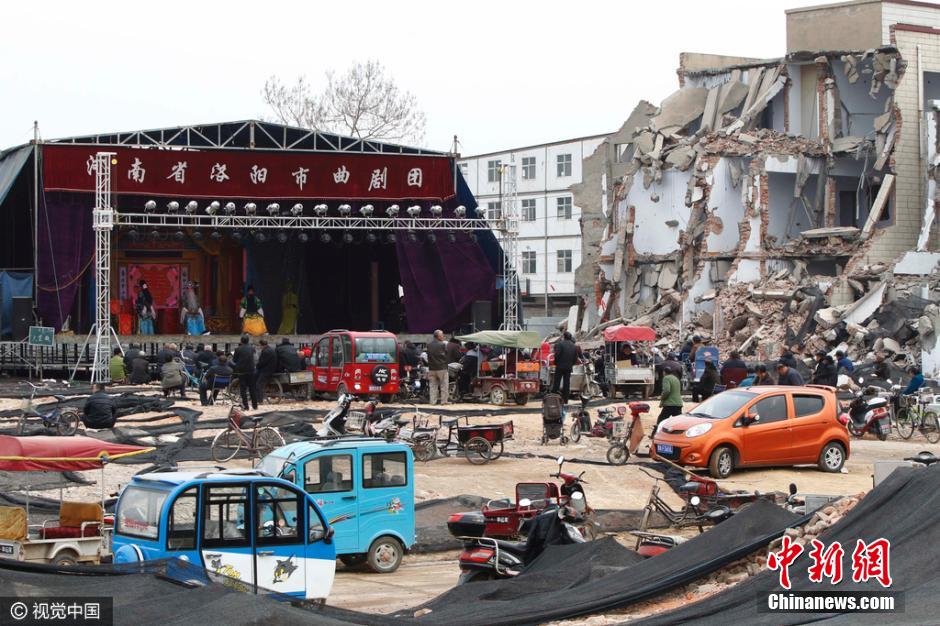 2016年3月23日,河南省鄭州市石佛村,拆遷后的都市村莊中,除了僅存的幾幢殘破的老樓外,其它民宅基本被夷為平地。在一個(gè)籃球場(chǎng)大小的鋼結(jié)構(gòu)戲臺(tái)出現(xiàn)在瓦礫廢墟之上,一出出豫劇正連軸上演。戲臺(tái)上,豫劇演員拉足了唱腔,傾力獻(xiàn)唱;戲臺(tái)下,數(shù)百名老人,扎堆擠做在大片碎磚之上沉醉于精彩唱段和劇情之中。放眼已成廢墟村莊,移動(dòng)式的露天戲臺(tái)在殘磚碎之中,頗顯歷史滄桑。圖片來源:視覺中國