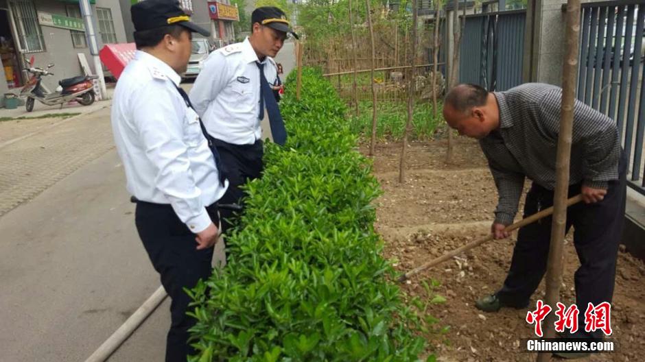 4月5日上午9時(shí)許,未來(lái)路街道巡防隊(duì)員司廣紅、盧龍等三人巡邏中發(fā)現(xiàn)一件奇葩事:有一根消防管從燕莊新區(qū)南院9號(hào)樓北面的20樓一家住戶窗口被放下,水管的另一頭直通小區(qū)柵欄里的小菜園。鄭州市燕莊村一村民住上了高樓,卻仍然放不下種地種菜。把小區(qū)垃圾清理出來(lái),開(kāi)墾出一片小菜園,又從20層的高樓往下放水澆菜。這種菜的成本遠(yuǎn)高于買菜,但他卻樂(lè)在其中。李四信 攝 圖片來(lái)源:視覺(jué)中國(guó)