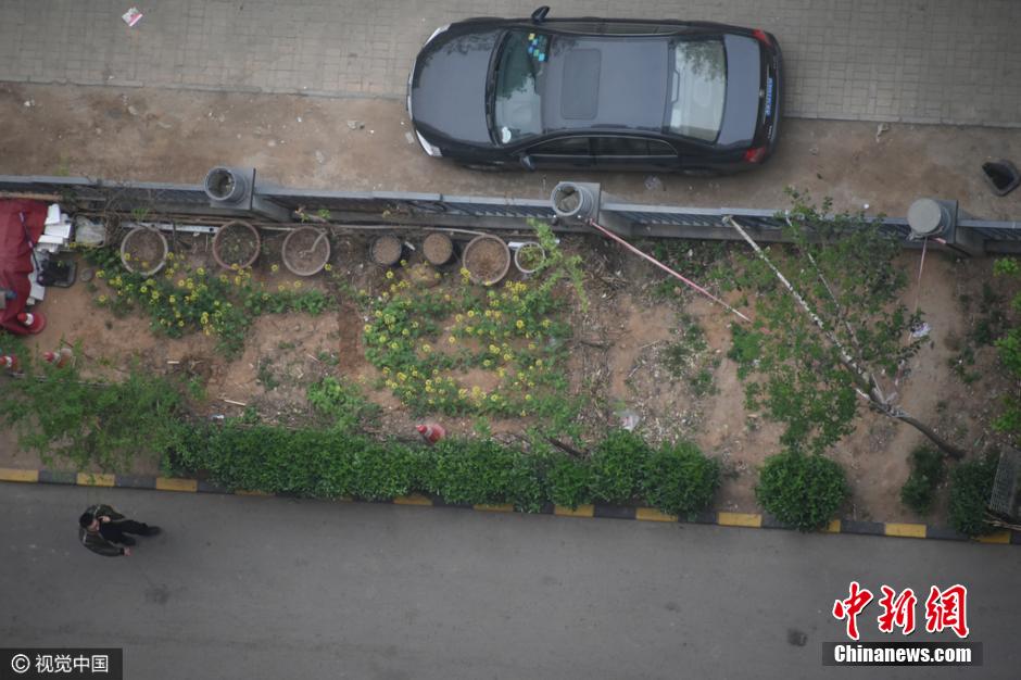 水管是從20樓放下來(lái)的,小菜園的主人用它來(lái)澆水?!蔽磥?lái)路巡防隊(duì)員司廣紅說(shuō)。在小菜園旁邊站著一名中年男子,手里拿著鐵锨。男子說(shuō),他是燕莊村民,姓張,家住9號(hào)樓20層。 李四信 攝 圖片來(lái)源:視覺(jué)中國(guó)