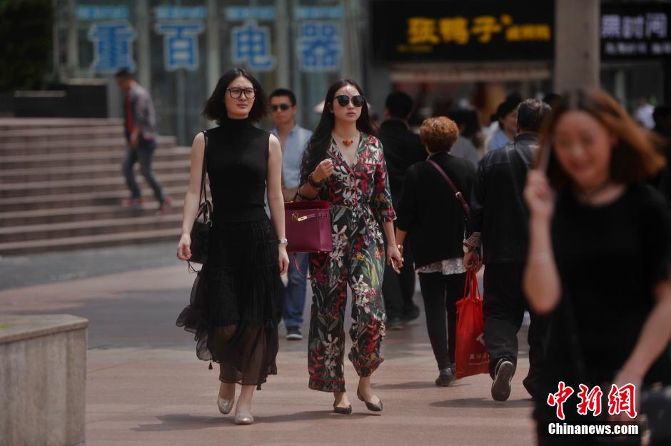 4月27日,重慶室外最高氣溫直逼30℃,觀音橋步行街上不少市民穿涼裝出行。陳超 攝