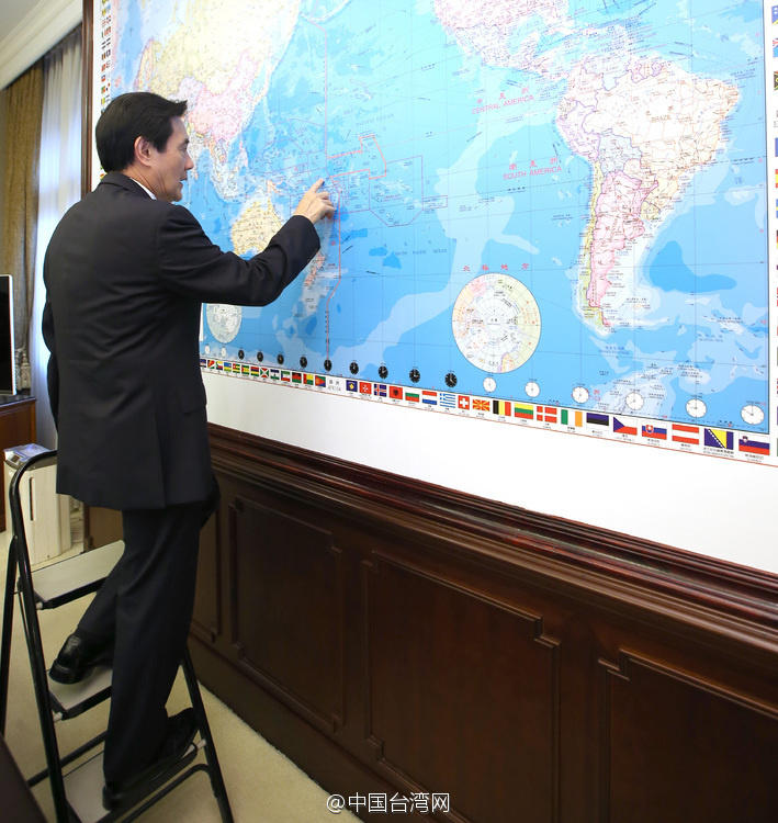 “總統(tǒng)”辦公室內有各式各樣的地圖,馬英九喜歡站在梯子上研究巨大地圖。