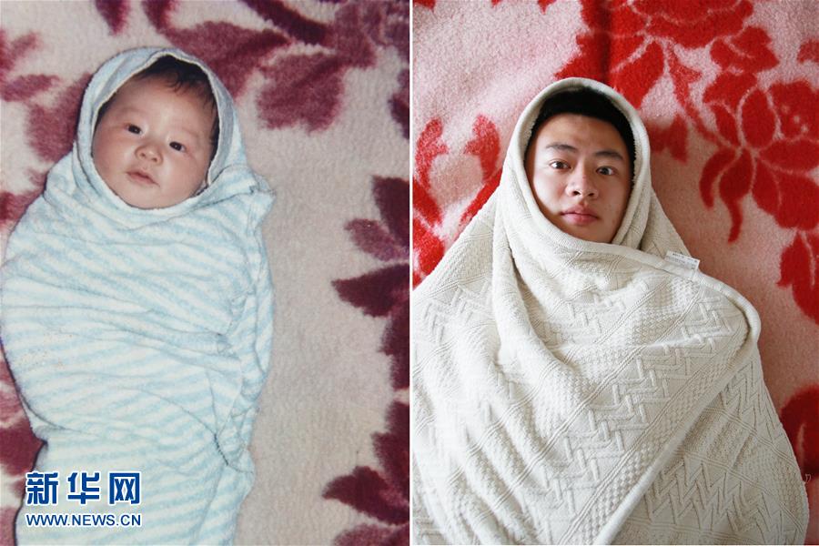 右圖:5月29日,24歲胡嘉巖擺出與童年照相仿的姿勢留影(新華社記者 薛玉斌 攝)。