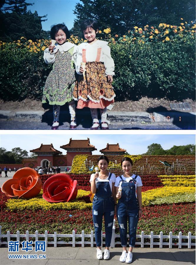 上圖:來自遼寧的朱虹4歲時手捧鮮花留影(1988年攝,資料照片);下圖:5月27日,32歲的朱虹手捧鮮花留影(新華社記者 潘昱龍 攝)。新華社發(fā)