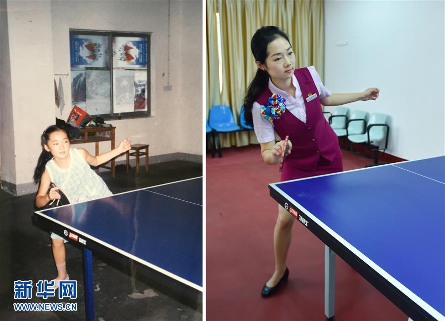 左圖:9歲的趙妍卿在打乒乓球(2000年攝,資料照片);右圖:5月25日,南昌鐵路局福州客運段動姐趙妍卿在單位乒乓球活動室打球(新華社記者 宋為偉 攝)。新華社發(fā)