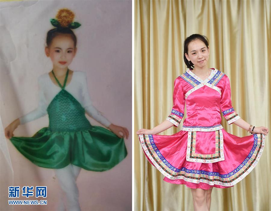 左圖:姜春曉童年時表演節(jié)目(資料照片);右圖:5月27日,福建福州市聾啞學?!?0后”音樂老師姜春曉在為學?!傲弧惫?jié)目做準備(新華社記者 宋為偉 攝)。新華社發(fā)