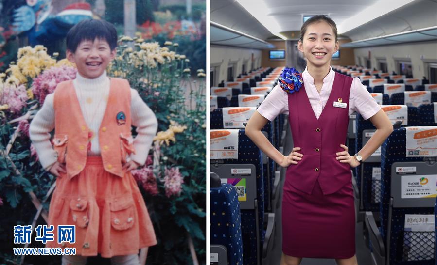 左圖:劉嘉楠6歲時的留影(1998年攝,資料照片);右圖:5月25日,24歲的南昌鐵路局福州客運段動姐劉嘉楠在動車內留影(新華社記者 宋為偉 攝)。新華社發(fā)
