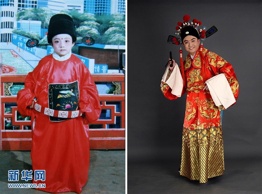 左圖:1992年“六一”兒童節(jié),6歲的李一博身著戲裝,在陜西省韓城市龍門鎮(zhèn)一家國營照相館留影(資料照片);右圖:5月30日,30歲的李一博身著戲裝,在陜西省西安市國色天香戲曲攝影工作室用遙控設備自拍留影。新華社發(fā)
