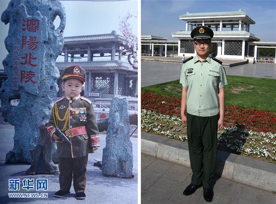 上圖:來自遼寧的雷鳴三歲時在沈陽市北陵公園留影(1993年攝,資料照片);下圖:5月28日,遼寧公安邊防總隊警官雷鳴在沈陽市北陵公園留影(新華社記者 潘昱龍 攝)。 新華社發(fā)