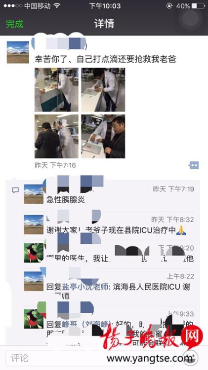 記者聯(lián)系上微信好友劉海峰,他告訴記者,昨天晚7點左右,他老爸重因病去濱??h人民醫(yī)院搶救,進入重癥病房后,跟著一名護士去喊醫(yī)生,看到一名男醫(yī)生坐在辦公室的看病歷。“我簡單說了一下爸爸的病情,他立刻推著掛著點滴的架子跑了出來。”圖片來源:揚子晚報網(wǎng)