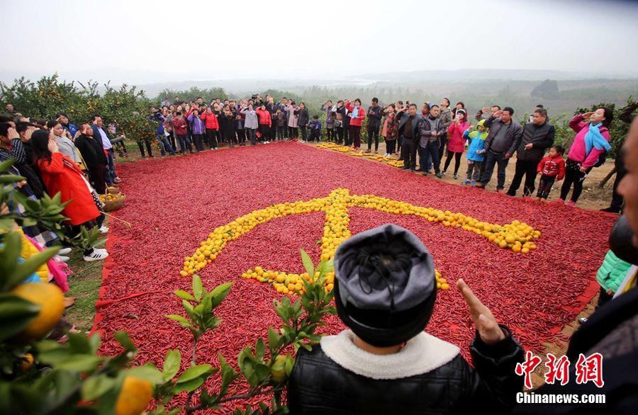 11月6日,南水北調(diào)中線工程水源地——河南淅川丹江大觀苑,滿園的桔子喜獲豐收,枝頭上碩果累累,多位農(nóng)民在桔子地里用豐收的金黃桔子和當(dāng)?shù)氐奶禺a(chǎn)紅辣椒拼成鮮艷奪目的巨幅黨旗。一位農(nóng)民告訴記者,為了拼這幅圖案,他們十幾個人整整用了兩天時間。吳揚 攝
