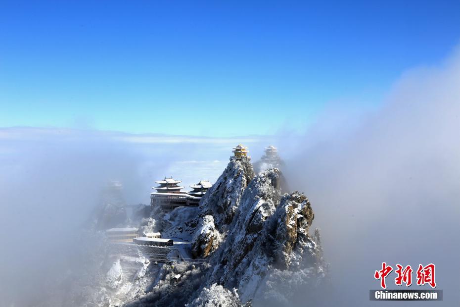1月7日,連續(xù)降雪之后,位于河南洛陽(yáng)的道教圣地老君山雪后初晴,海拔2000米的伏牛山主峰上,白雪皚皚、銀裝素裹,加之云海浮現(xiàn)與藍(lán)天白云交相輝映,絕壁道觀似瓊樓玉宇幻如仙境美不勝收。圖為云海流過(guò)山間。王中舉 攝