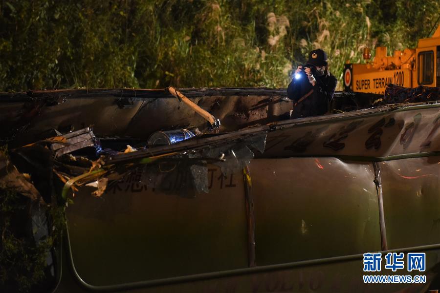 2月14日,工作人員在事故車輛內(nèi)取證。據(jù)臺灣消防部門2月14日零時許發(fā)布的消息,13日晚發(fā)生的翻車事故已造成32人死亡,受傷的12人已全數(shù)送醫(yī)。新華社記者從臺灣公路警察部門獲悉,游覽車上沒有大陸游客。臺北市消防局通報,13日21時6分許,在臺灣公路主干道5號南港系統(tǒng)交流道接3號南下路段,臺北市蝶戀花公司一輛游覽車翻覆于引道邊坡,車內(nèi)共44人(游客42人,導(dǎo)游、司機(jī)各1人),其中死亡32人(30人未送醫(yī),2人送醫(yī)后不治),12人送醫(yī)持續(xù)治療中。新華社記者 歐東衢 攝
