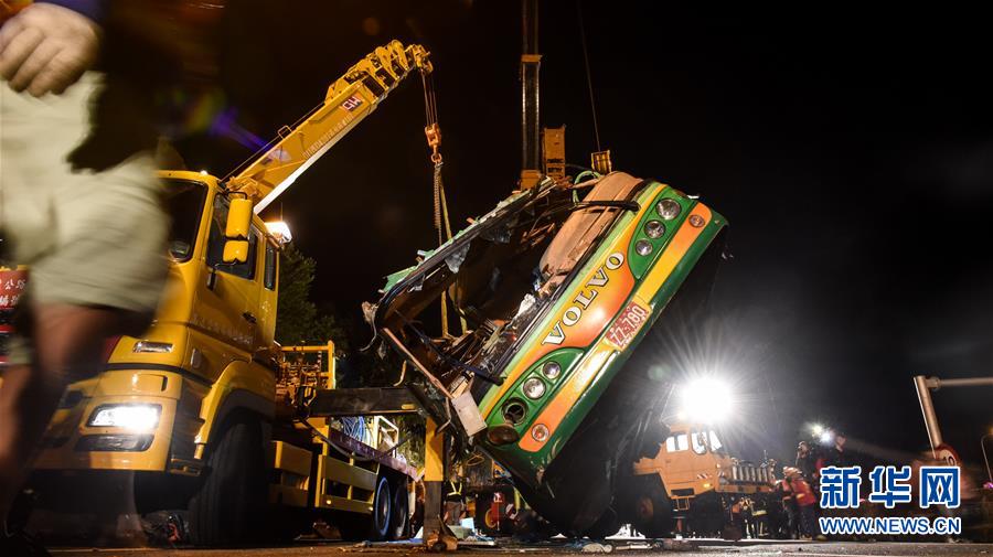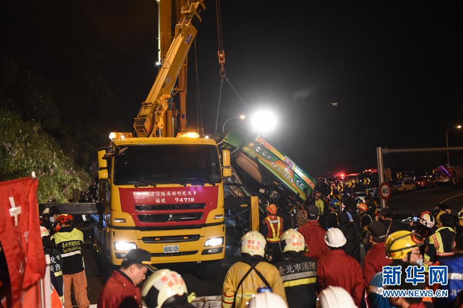 2月14日,事故車輛被吊車吊起。據(jù)臺灣消防部門2月14日零時許發(fā)布的消息,13日晚發(fā)生的翻車事故已造成32人死亡,受傷的12人已全數(shù)送醫(yī)。新華社記者從臺灣公路警察部門獲悉,游覽車上沒有大陸游客。臺北市消防局通報,13日21時6分許,在臺灣公路主干道5號南港系統(tǒng)交流道接3號南下路段,臺北市蝶戀花公司一輛游覽車翻覆于引道邊坡,車內(nèi)共44人(游客42人,導(dǎo)游、司機(jī)各1人),其中死亡32人(30人未送醫(yī),2人送醫(yī)后不治),12人送醫(yī)持續(xù)治療中。新華社記者 歐東衢 攝