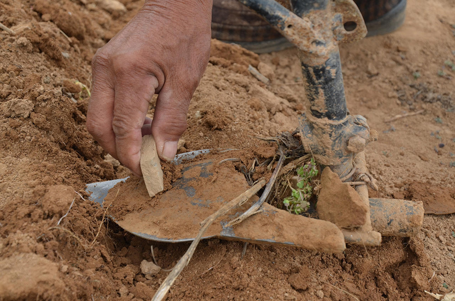 說是鋤,看起來又像犁,地里有墑,用一段就要用瓦片把泥土刮去,要不推起來就會費(fèi)力,這個(gè)動作和鋤地一樣,鋤過地的都知道。