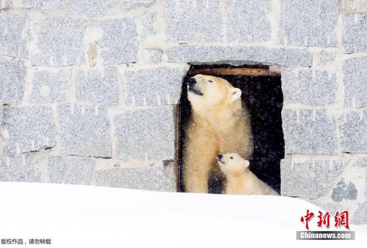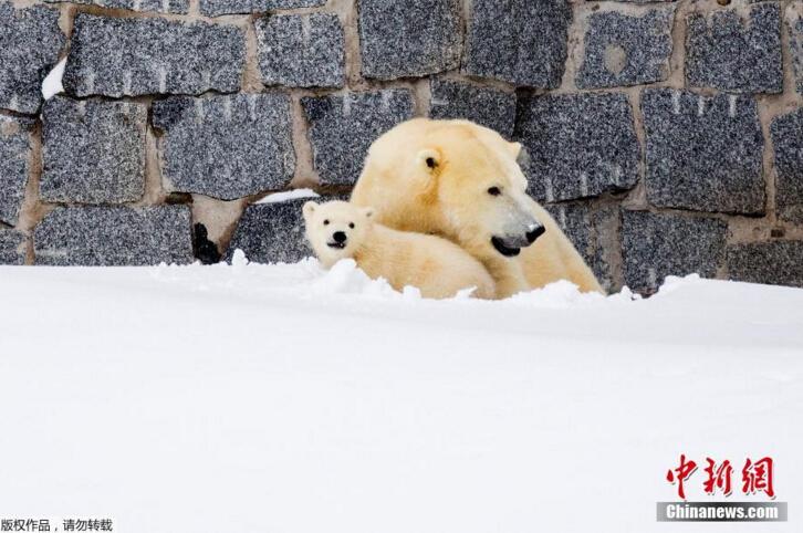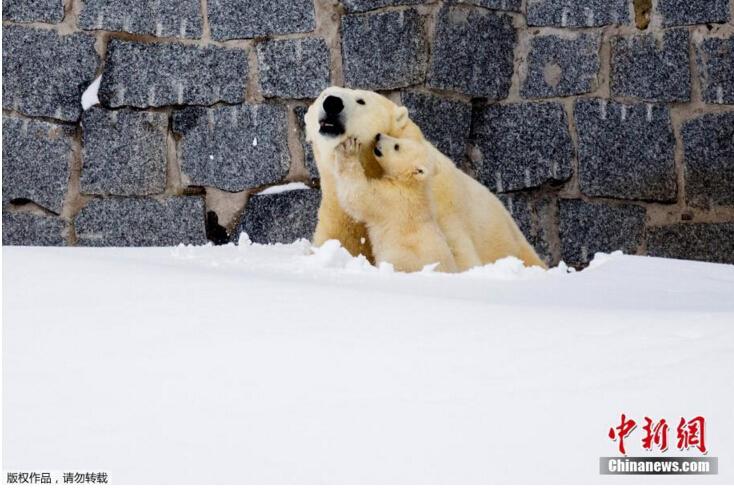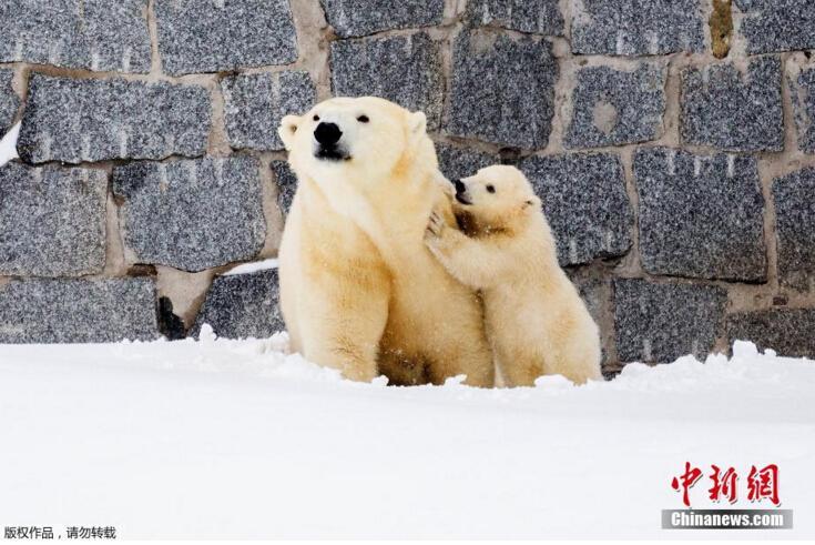 當?shù)貢r間3月15日,芬蘭一野生動物園內,北極熊母親帶著她的幼崽第一次在戶外亮相。小北極熊第一次在雪中玩耍,跟母親“求抱抱”。